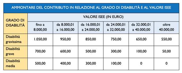 Nello specifico ecco gli importi spettanti in funziona del grado di disabilità e del valore ISEE espresso in euro: